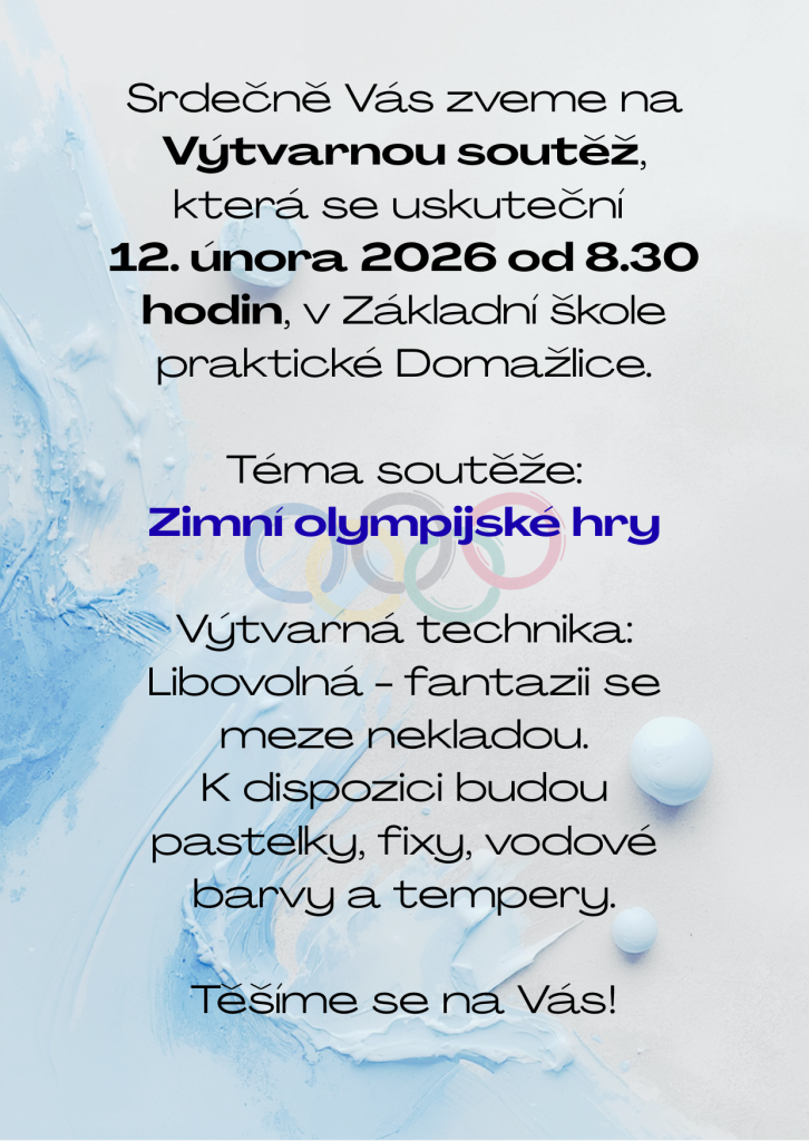 Srdečně vás zveme na výtvarnou soutěž, která se uskuteční 12. února 2026 od 8:30 hodin v Základní škole praktické Domažlice. Téma soutěže je zaměřeno na 7. Zimní olympijské hry a účastníci mohou využít libovolnou výtvarnou techniku. K dispozici budou pastelky, fixy, vodové barvy a tempera, takže fan